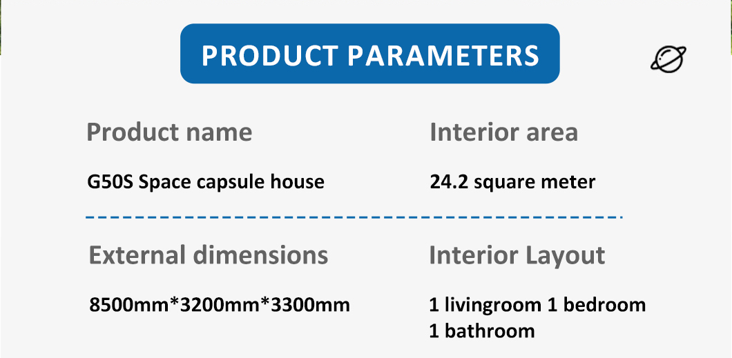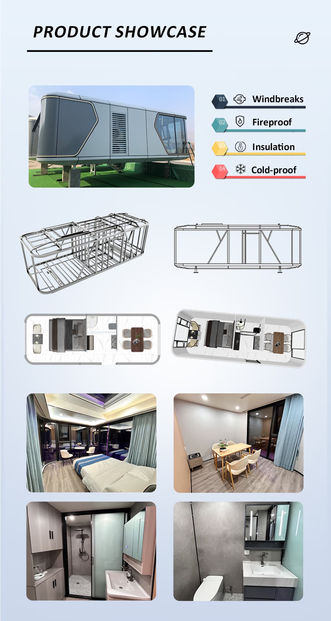 | Sistema de decoração de interiores | Forro suspenso (placa OSB + placa de fibra de carbono) Revestimento da parede interna (placa OSB + placa de fibra de carbono) Piso para interiores (piso com sistema de encaixe SPc) Sistemas de aquecimento de piso radiante Porta do banheiro (porta de vidro deslizante para privacidade) Lavatório (personalizado em mármore) Paredes do banheiro (placa de encaixe SPC) Piso do banheiro (azulejos) Móveis como camas, mesas de cabeceira, sofás, etc. (podem ser personalizados) |
